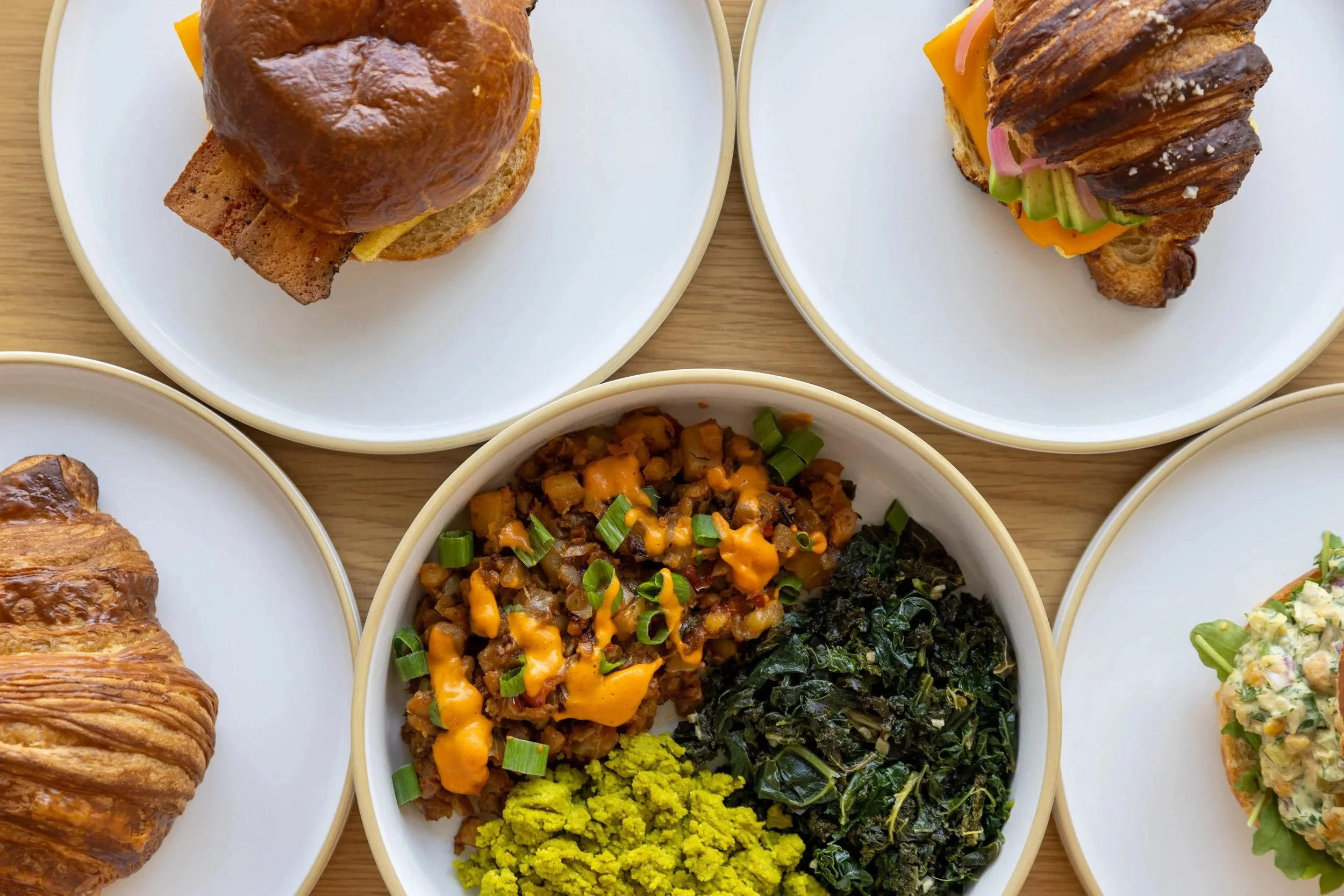 The Classics: We offer our loaded BLAT (Bacon, Lettuce, Avocado, Tomato; choice of bread), Chickpea Salad Sandwich (on brioche or croissant), and our Maple Dijon Tofu Sandwich (on pretzel brioche) in both full and catering sizes.